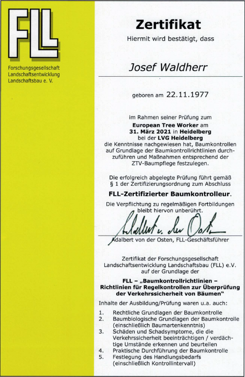 Das FLL-Zertifikat für Baumkontrollen wird an Fachleute vergeben, die über umfassende Kenntnisse und Erfahrung in der Beurteilung und Überprüfung des Zustands von Bäumen verfügen. Es bestätigt die Fähigkeit, Baumkontrollen gemäß den hohen Qualitätsstandards des Forschungsinstituts für Landschaftsbau und Landschafts-entwicklung durchzuführen.