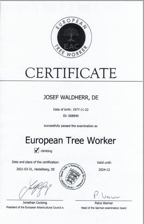 Der European Tree Technician ist ein zertifizierter Fachmann im Bereich der Baumpflege und Baummanagement. Mit umfangreichem Wissen über Baumarten, Pflanzungstechniken und Baumschutzmaßnahmen unterstützt er bei der Erhaltung und nachhaltigen Entwicklung von Bäumen in städtischen und ländlichen Umgebungen.
